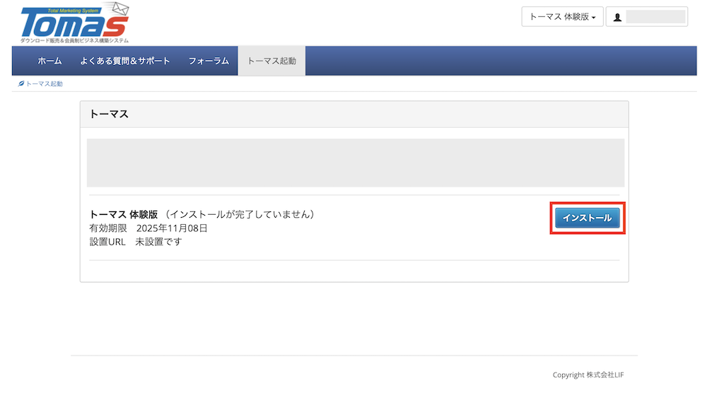 無料版登録後の画面から「ツール起動」→インストールボタンを押しますとインストール手順が画面が表示されます。