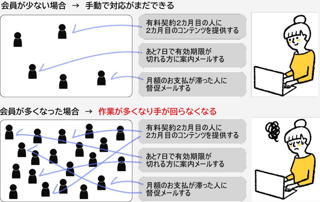 毎日発生する会員への対応も数が少ないうちは自力で対応できますが、増えてくると手が回らなくなり、対応漏れやミスも発生しやすくなります。