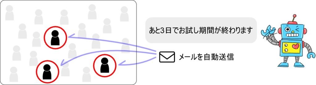 例えば、有料会員のお試しを14日間設けていて、その有効期限が切れそうな人にメールをして、入会しなかった人を自動でメルマガ会員に移行するなどの処理が可能になります。