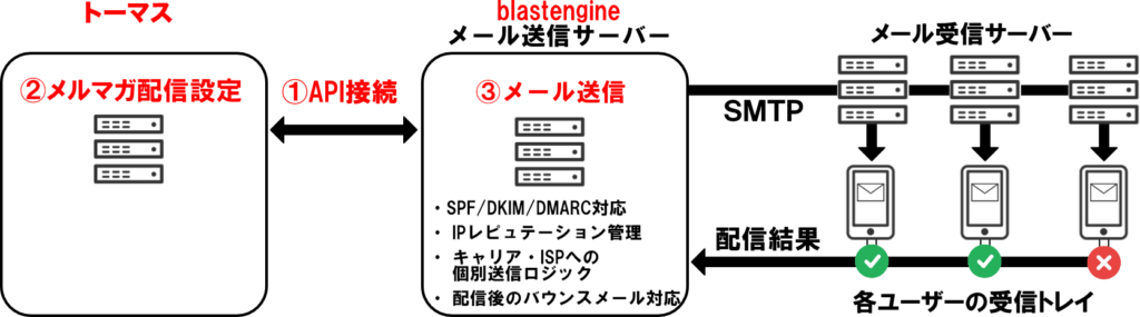そこで、自前では運用が難しい「メール送信サーバー」の構築をメール配信エンジン「blastengine」を利用して解決することができます。